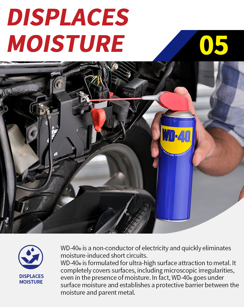 WD-40® Multi-Use Product lubricates moving parts such as hinges, wheels, rollers, chains and gears. It protects against rust and corrosion on items like tools and sporting equipment. It penetrates to free stuck corroded parts like nuts, bolts, valves and locks. It quickly removes adhesives, corrosion and paint. It displaces moisture to restore water flooded equipment such as engines, spark plugs and power tools.